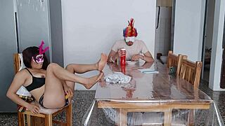 A sexy maid flashes her natural big tits fulfilling his home fetish