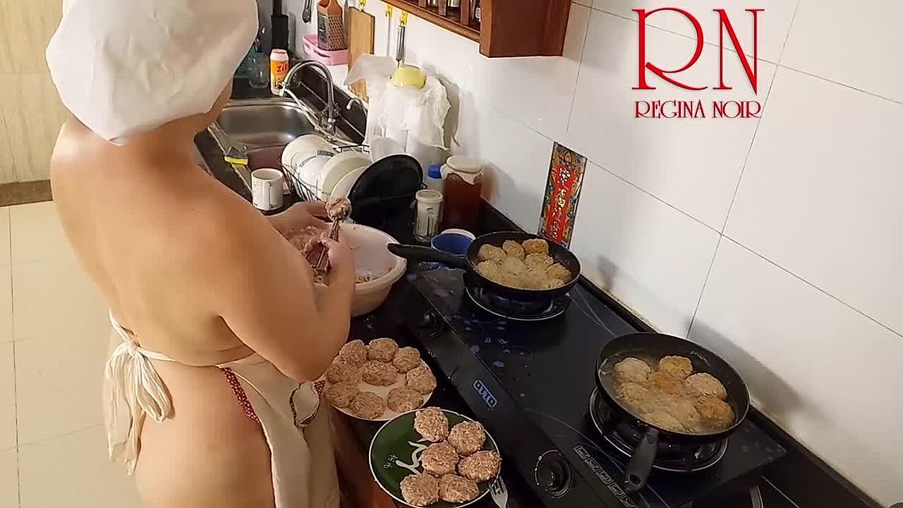 Bold housewife in pantyhose gets intense orgasm as naked maid in kitchen.